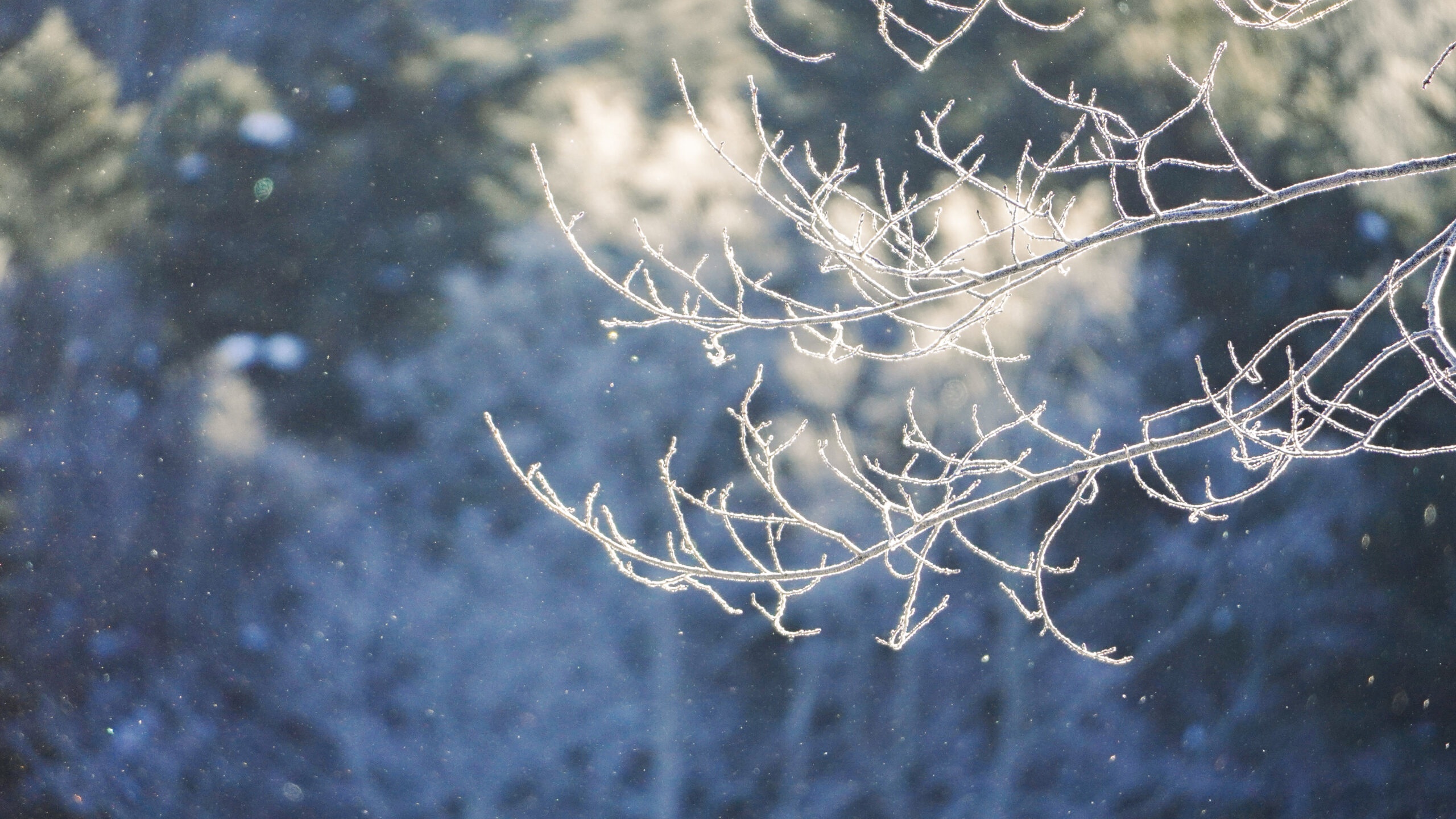 日の出あたりの時間帯の気温差によって、幻想的な霧氷の風景がみられます。